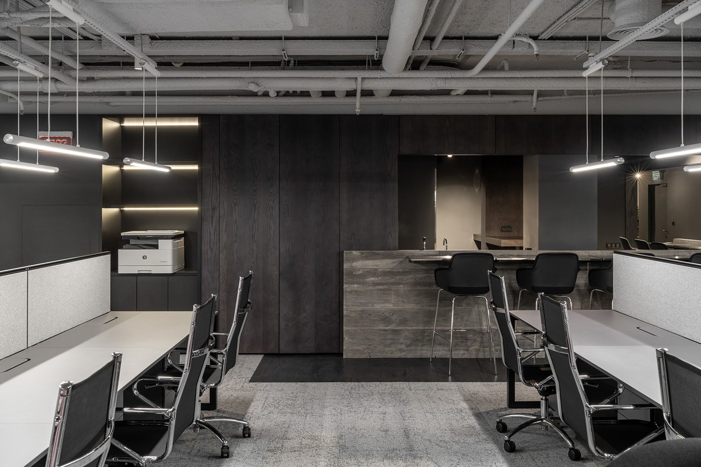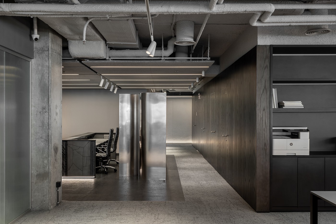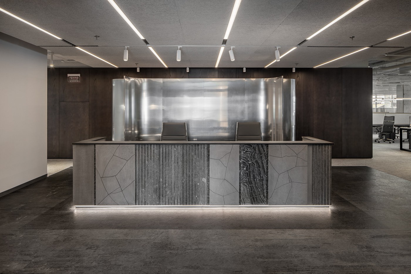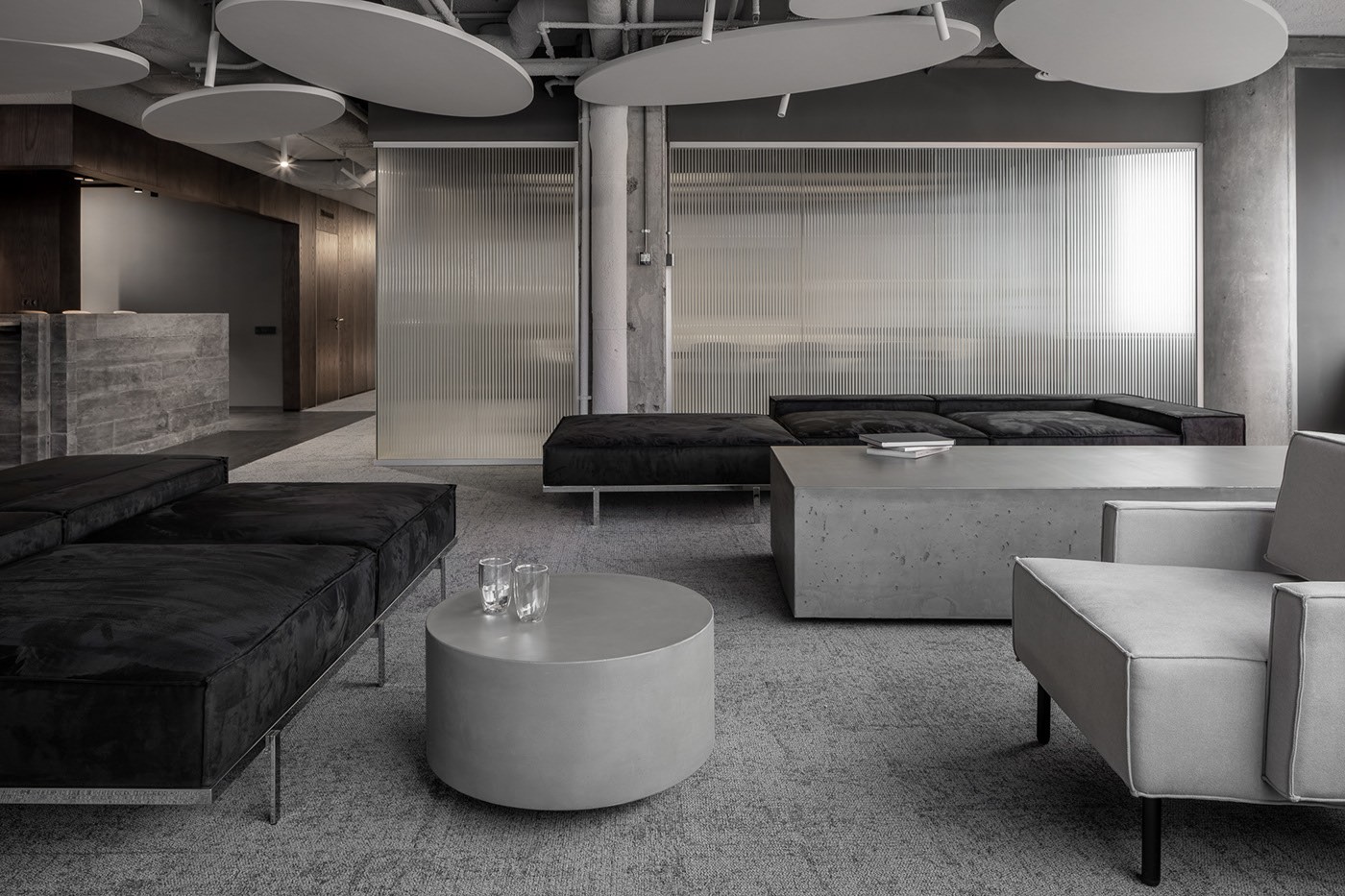 在分析了公司以及團隊的平均年齡(40 歲以上)和他們的需求之后,我們決定專注于簡單和極簡主義。我們的團隊設(shè)計了一個連貫的單色空間,沒有多余的裝飾和視覺噪音,并采用拋光金屬結(jié)構(gòu)和其他獨特元素加以增強。材料以其真實狀態(tài)實施:混凝土——堅固且有紋理,金屬——粗糙和裸露,木材——始終是真實的,從不模仿。