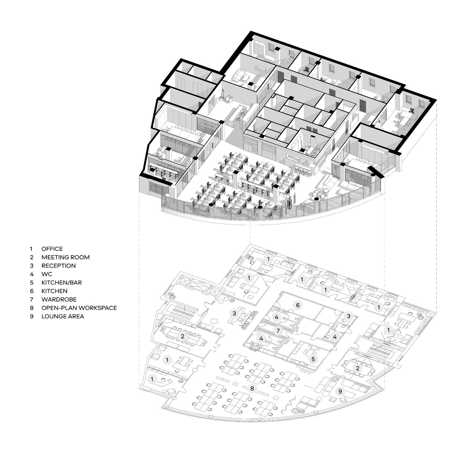 Vol12 面積為 550 平方米。我們的主要任務(wù)是為大約 30 人配備舒適、現(xiàn)代化的辦公室。另一個目標(biāo)是將任何現(xiàn)有的工程通信整合到我們的設(shè)計中,并為空間提供高質(zhì)量的隔音效果。