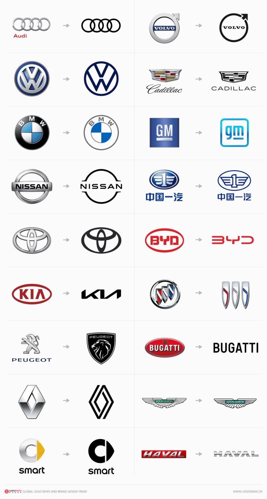 回顧近幾年改車標(biāo)的例子,大多數(shù)升級改造均會保留其特有的造型和符號,以保持視覺資產(chǎn)的延續(xù)和傳承。下面這些變化中,只有起亞完全重新設(shè)計了字體;標(biāo)致雖然新舊變化巨大,但它所使用的盾形圖標(biāo)其實是1960年代的優(yōu)化版。