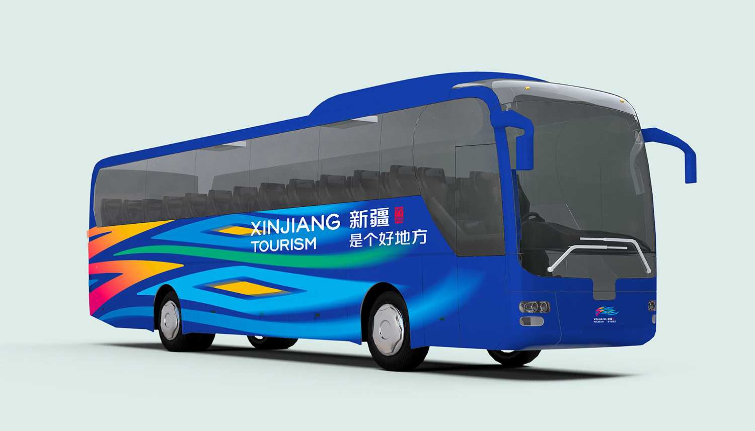靈動飄逸的圖形的下方標(biāo)有中英文雙語的口號「新疆是個(gè)好地方(XINJIANG TOURISM)」,進(jìn)一步彰顯了新疆旅游的國際化視野與現(xiàn)代發(fā)展理念。「新疆」的右側(cè)綴以篆書印章的形式表達(dá)傳承與創(chuàng)新。